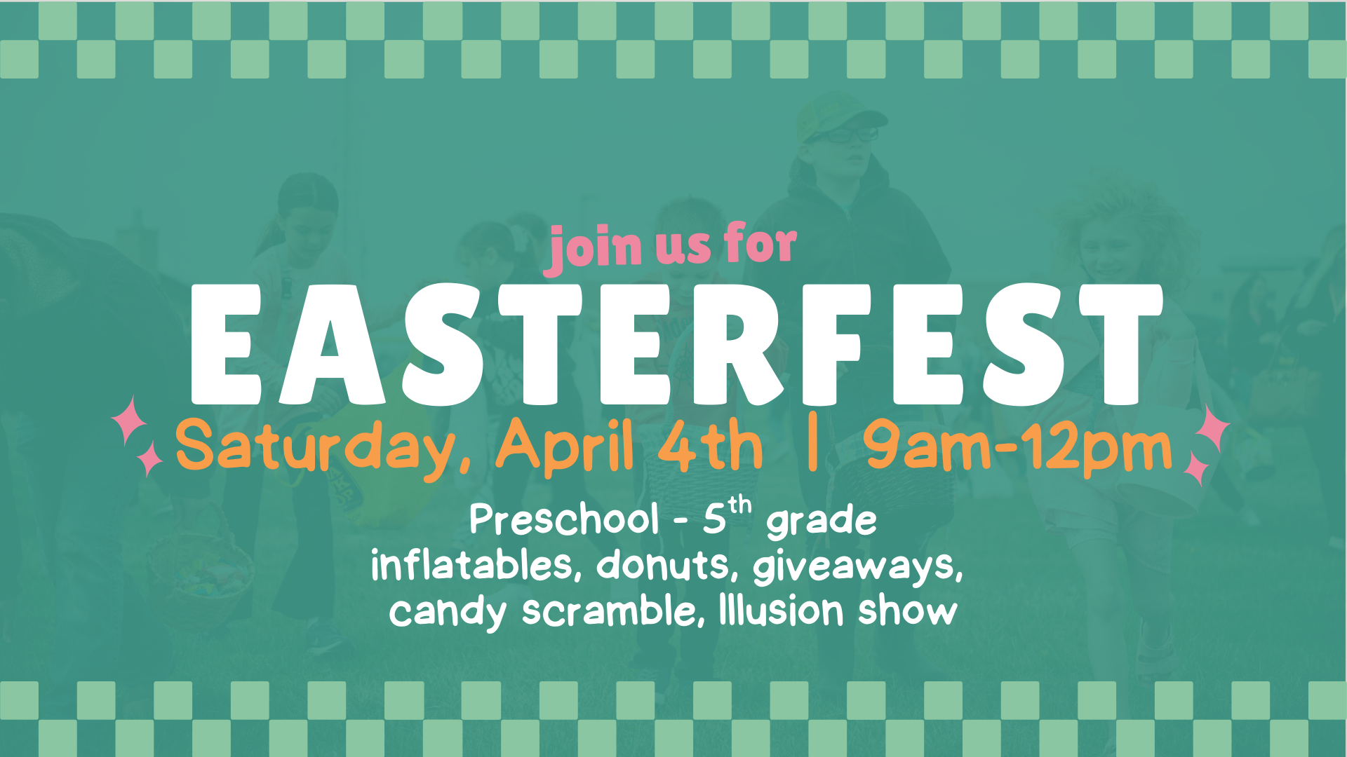 Join us for a family fun day as we celebrate Jesus! Kids preschool to 5th grade will enjoy inflatables, donuts, give aways, the candy scramble, and an illusion show!