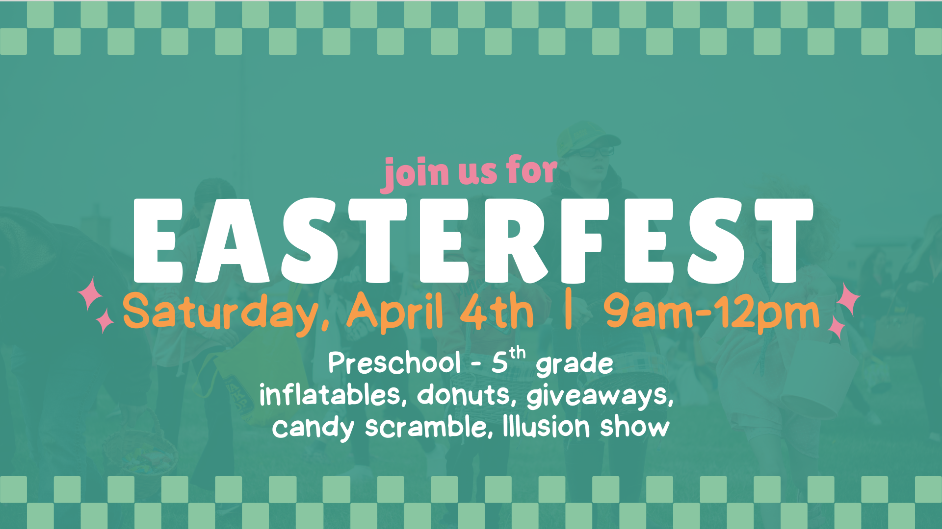 Join us for a family fun day as we celebrate Jesus! Kids preschool to 5th grade will enjoy inflatables, donuts, give aways, the candy scramble, and an illusion show!